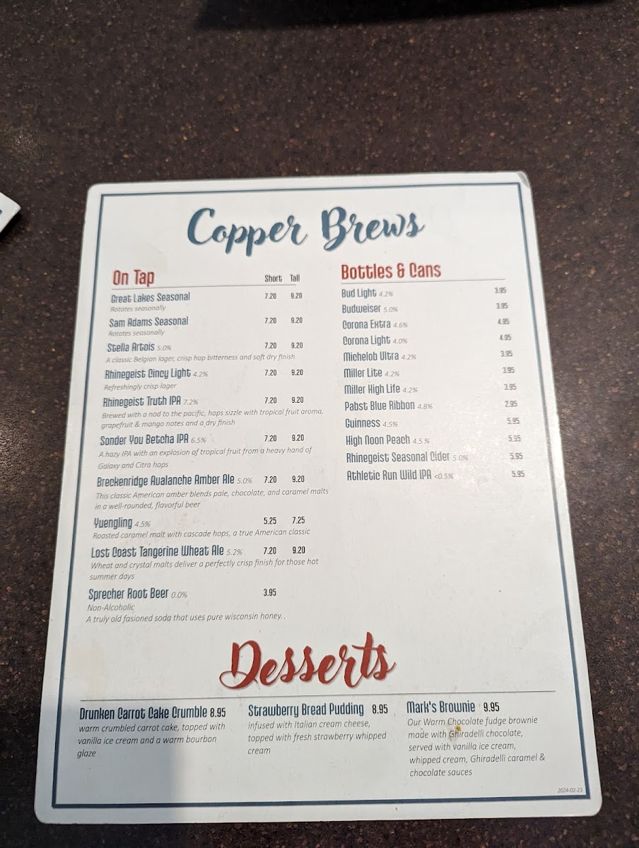 Desserts include selections like hot fudge pie and bread pudding, providing sweet options to conclude the meal. Copper Blue also features a craft beer selection for beverage pairing.